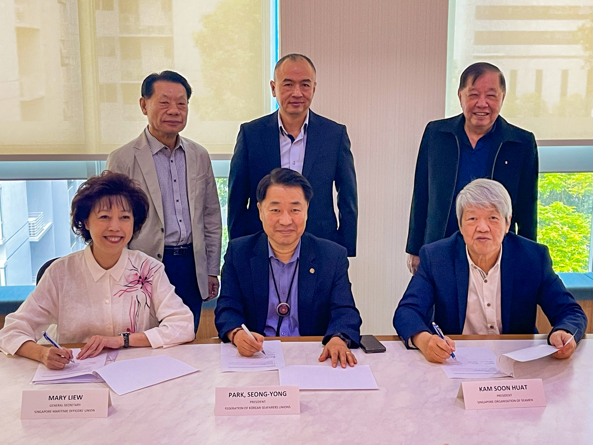 The meeting concluded with the signing of a Memorandum of Understanding (MOU) by FKSU President Park Seong-Yong, SMOU General Secretary Mary Liew, and SOS President Kam Soon Huat, symbolising renewed commitment to collaboration and seafarers’ welfare.
