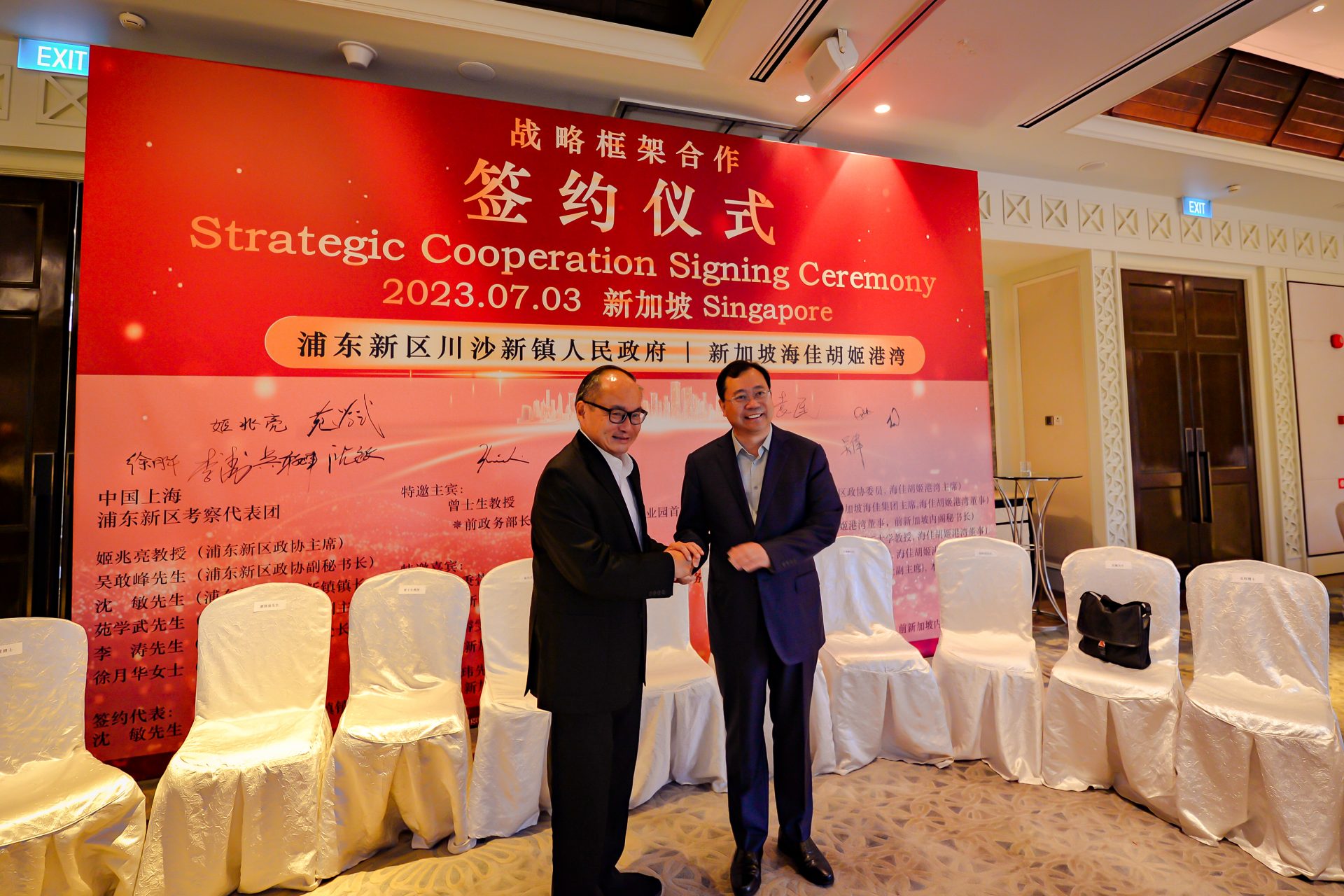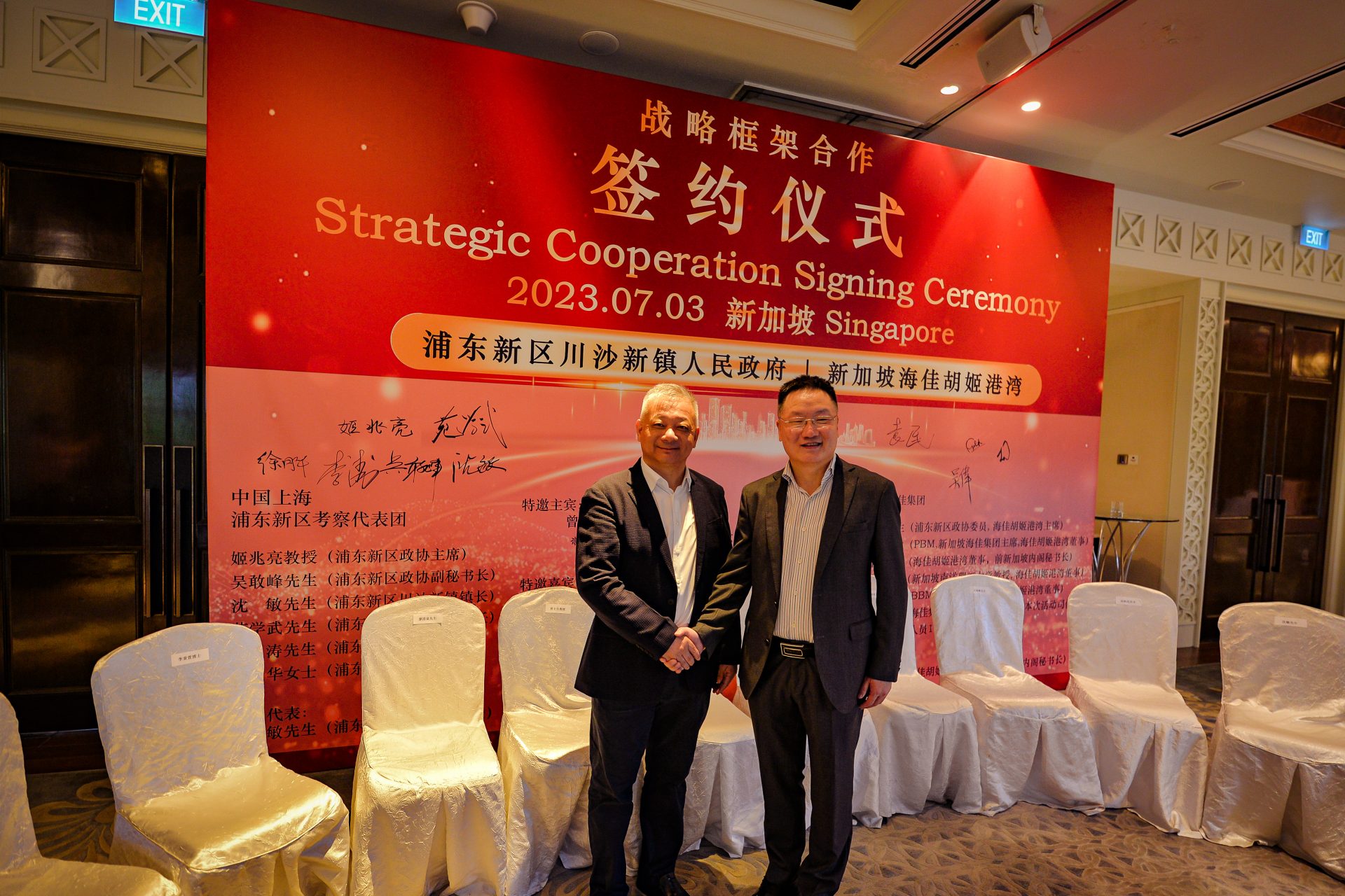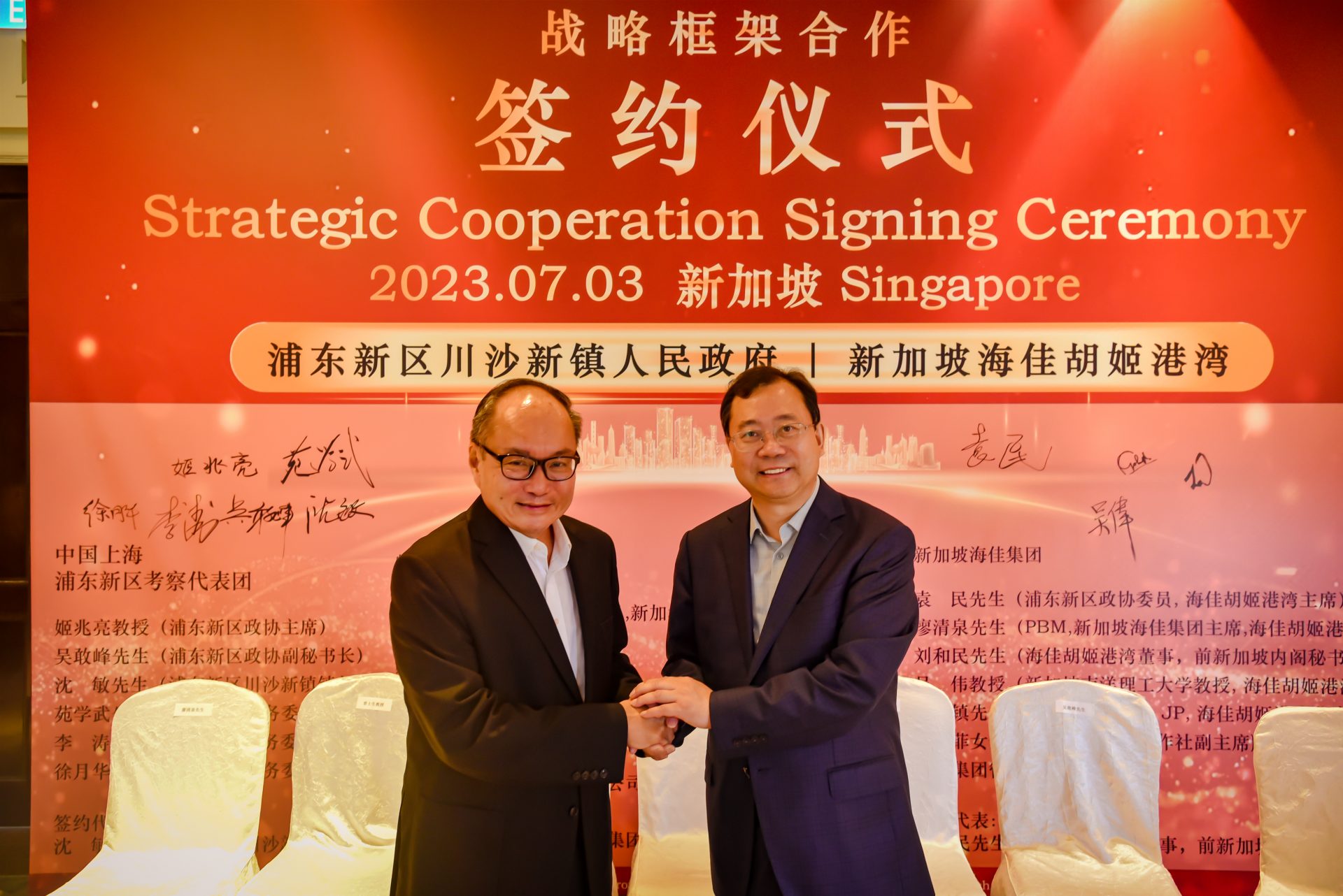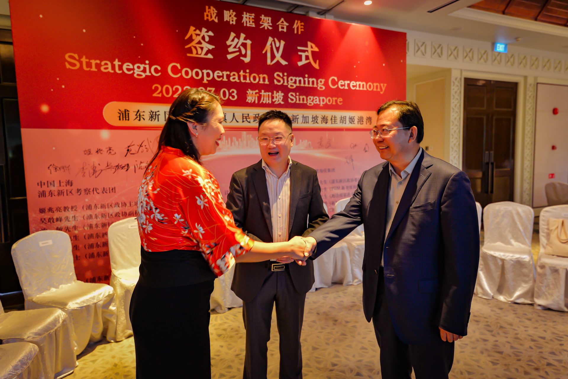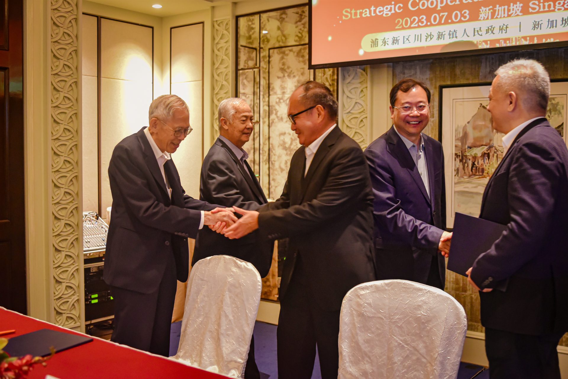 签署仪式于 2023 年 7 月 3 日在新加坡香格里拉大酒店举行,由浦东新区政协主席姬兆亮教授率领的上海高级代表团出席了签字仪式。与会代表包括浦东新区政协副秘书长吴敢峰先生,川沙新镇镇长沈敏先生,浦东新区商务委员会副主任苑学武先生,浦新区商务委员会处长李涛先生,和浦东新区商务委员会的许月华女士。