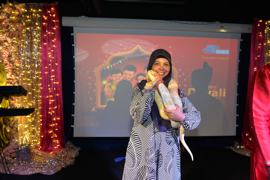 The celebration continued with vibrant traditional dances, followed by a special performance by Singapore’s only snake charmer. His act fascinated the audience, blending entertainment with education. Guests even had the chance to pose with his snakes for memorable photos.