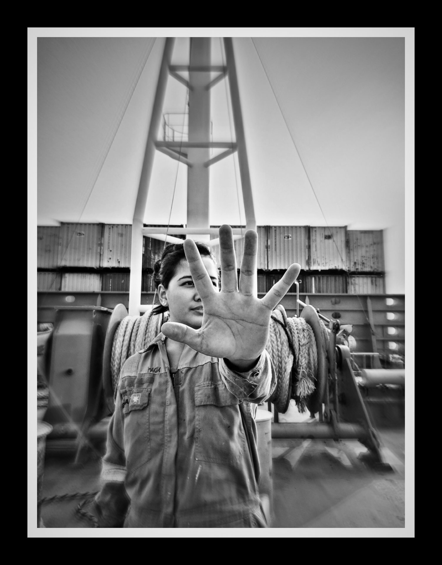 The empowered woman in the photo, Lyra Vargas, is a seafarer in transit from the Mediterranean Sea to the Indian Ocean via the Suez Canal. The crew are preparing the vessel before entering a High-Risk Piracy Area. The judges were captivated by how Israel captured Lyra’s spirited expression against a backdrop of a vessel at sea and at risk.